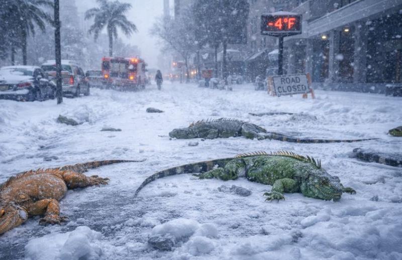 फ्लोरिडा के ऑरलैंडो में न्यूनतम तापमान माइनस 4 डिग्री सेल्सियस दर्ज किया गया, जो फरवरी महीने में साल 1923 के बाद का सबसे कम तापमान है। 100 साल बाद आई इस रिकॉर्ड ठंड ने मौसम वैज्ञानिकों को भी हैरान कर दिया है। सामान्यतः यहाँ इन दिनों तापमान 12 से 23 डिग्री के बीच रहता है। ठंड के कारण ठंडे खून वाले जीव इगुआना के शरीर ने काम करना बंद कर दिया और वे सड़कों व फुटपाथों पर बेसुध पड़े नजर आए। प्रशासन ने वन्यजीवों की सुरक्षा के लिए इमरजेंसी आदेश जारी किए हैं, जिसके तहत नागरिकों को इन जीवों को सुरक्षित स्थानों या सरकारी दफ्तरों तक पहुंचाने की छूट दी गई है। बचाव कार्य में जुटी जेसिका किलगोर के मुताबिक, ठंड की तीव्रता इतनी अधिक थी कि सड़कों से सैकड़ों किलो इगुआना इकट्ठा किए गए, जिनमें से कई की मौत हो चुकी थी।