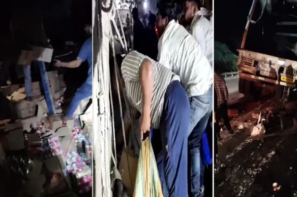 सड़क पर शराब से भरा ट्राला पलटा, लूट मचाने पहुंची भीड़ ने पुलिस पर किया पथराव