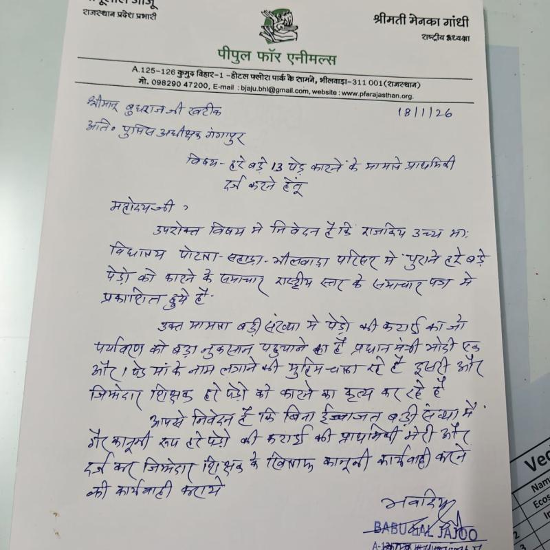 भीलवाड़ा। राजकीय उच्च माध्यमिक विद्यालय, पोटला सहाड़ा परिसर में लगभग 13 पेड़ों की कटाई किए जाने के मामले में पीपुल फॉर एनिमल्स के प्रदेश प्रभारी बाबूलाल जाजू ने अतिरिक्त पुलिस अधीक्षक गंगापुर को प्राथमिकी दर्ज कराई है।